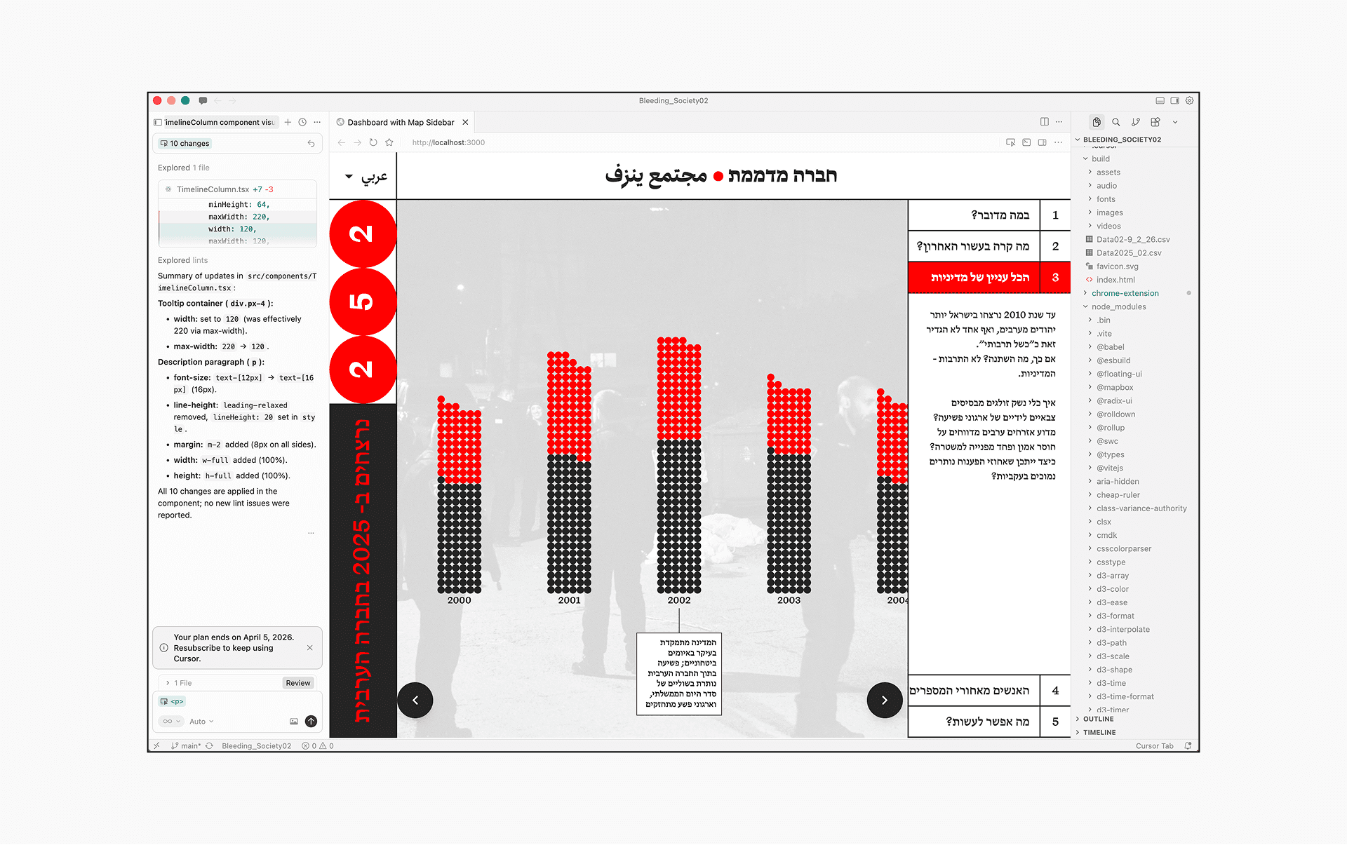 This included integrating a Mapbox map with the datasets I created, connecting the map to the control menu, and building an interactive graph based on the datasets, with tooltips for additional context.